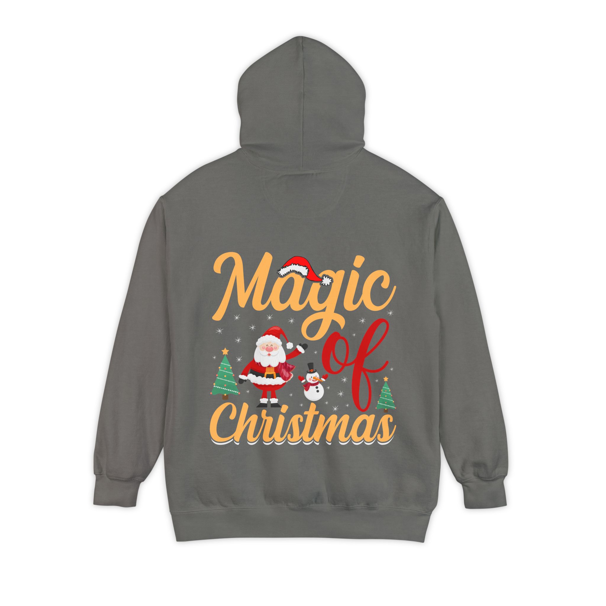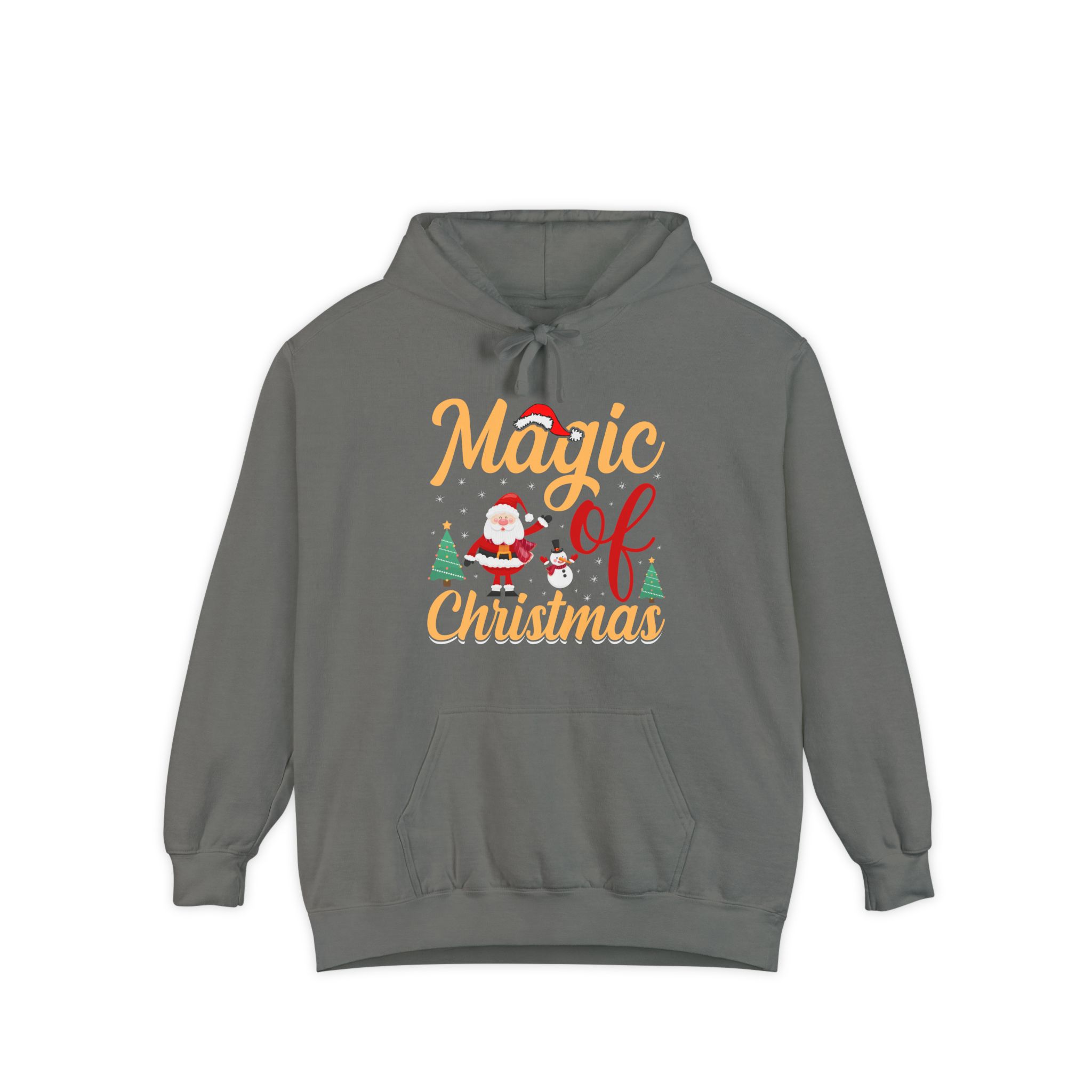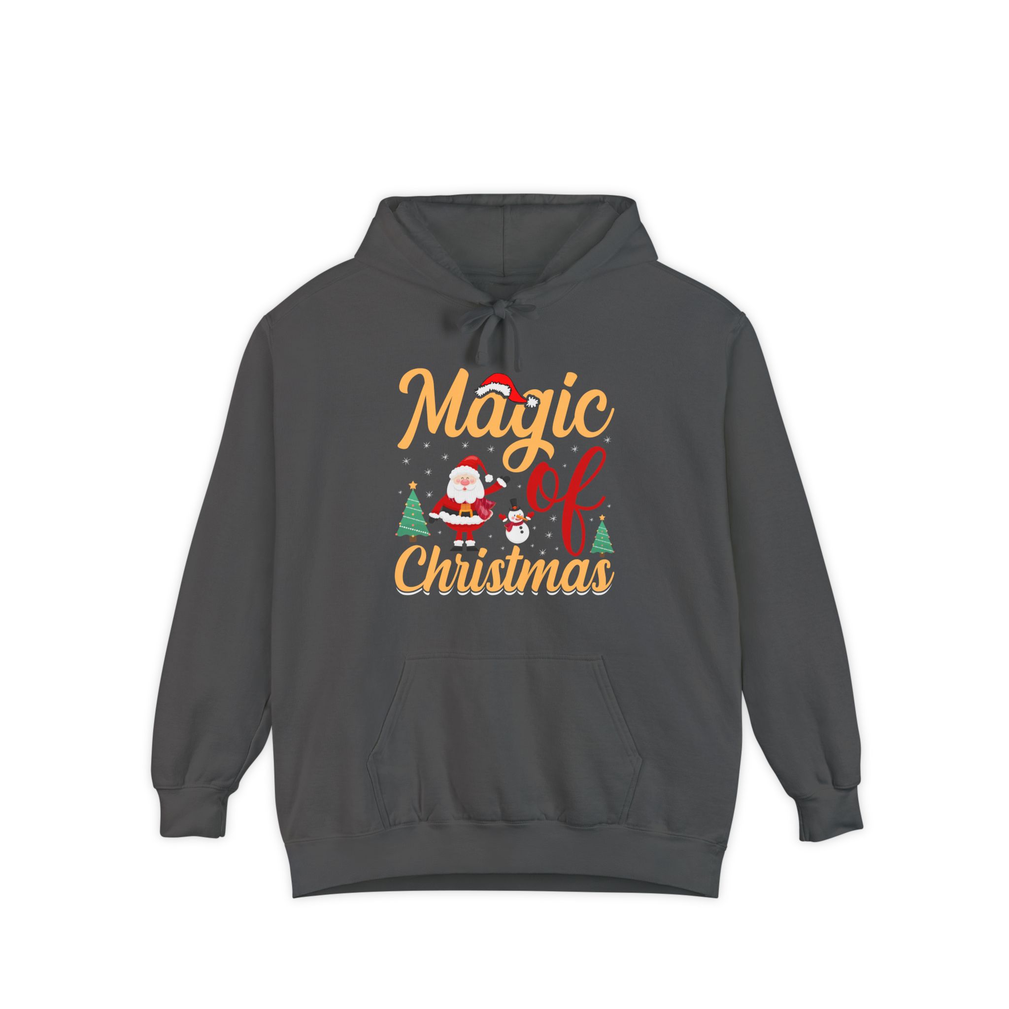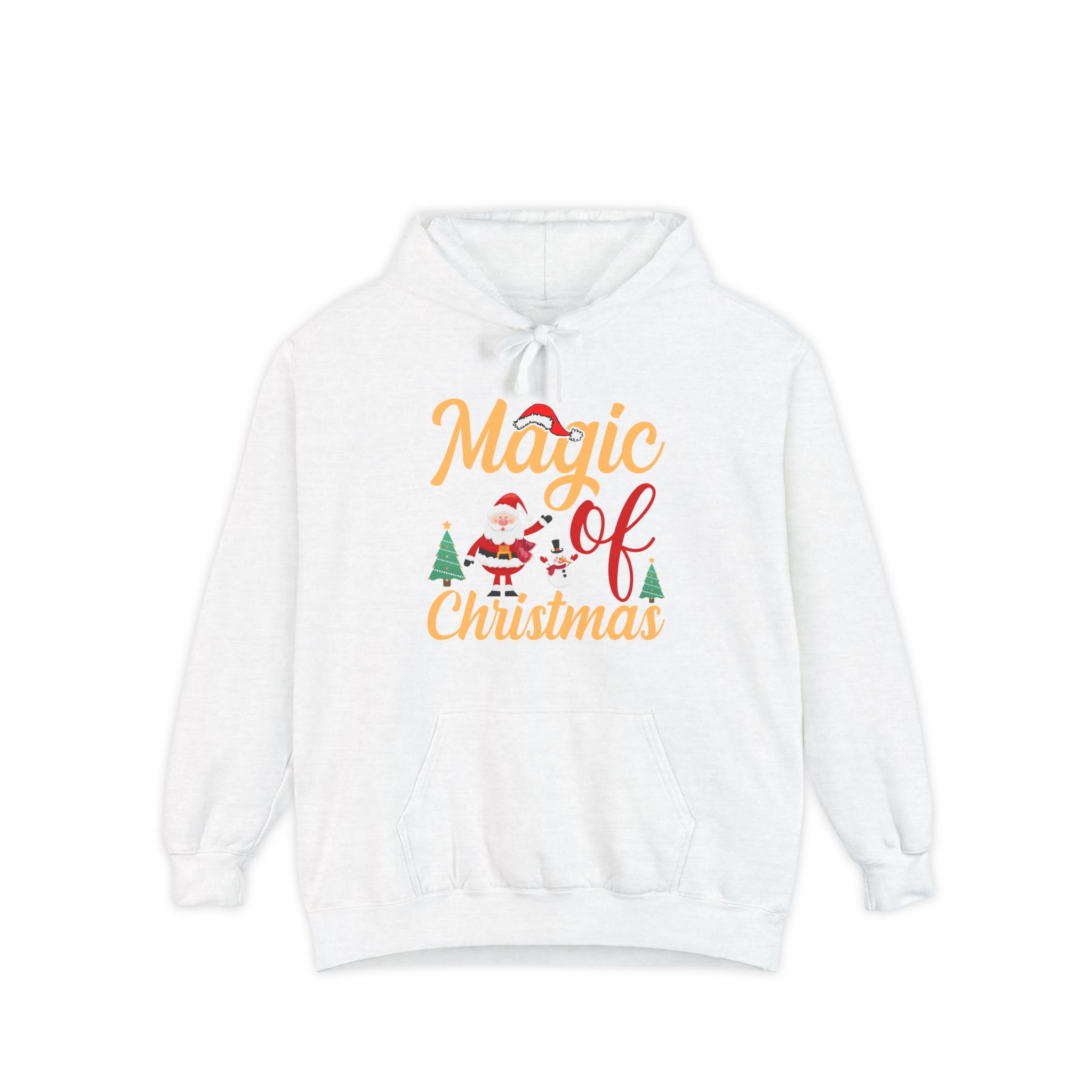 Wrap yourself in cozy holiday cheer with this garment-dyed hoodie that feels lived-in from the first wear. The soft 80/20 ringspun cotton blend and heavy-weight fabric give it a substantial, comforting drape while the relaxed fit invites long evenings by twinkling lights or chilly morning walks to sip something warm. A playful “Magic of Christmas” motif — complete with Santa, tiny trees, and cheerful lettering — sits on the chest, adding a nostalgic, handcrafted vibe that complements family gatherings, tree-trimming nights, and low-key holiday outings. Thoughtful details like a lined hood with matching drawcords, ribbed cuffs and hem that keep shape, and reinforced necktape ensure this hoodie stays comfortable and dependable year after year.