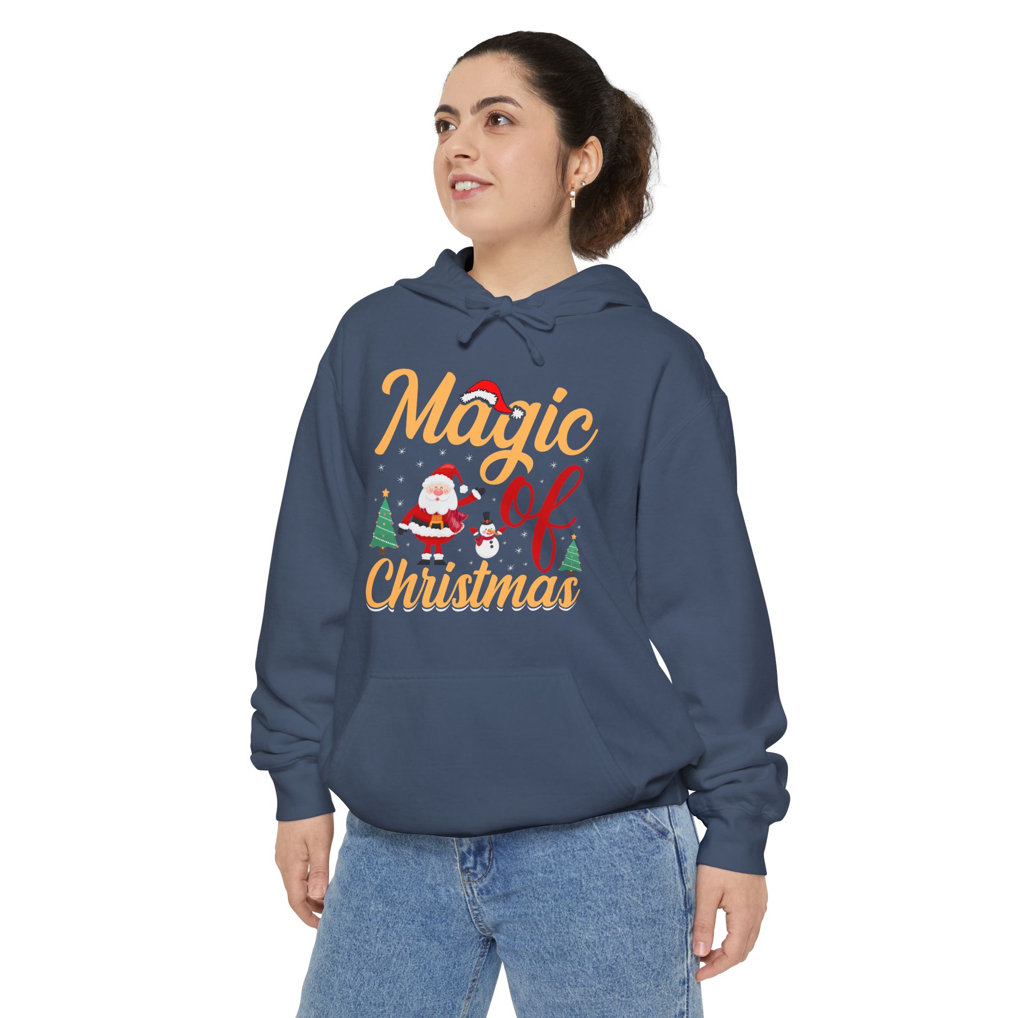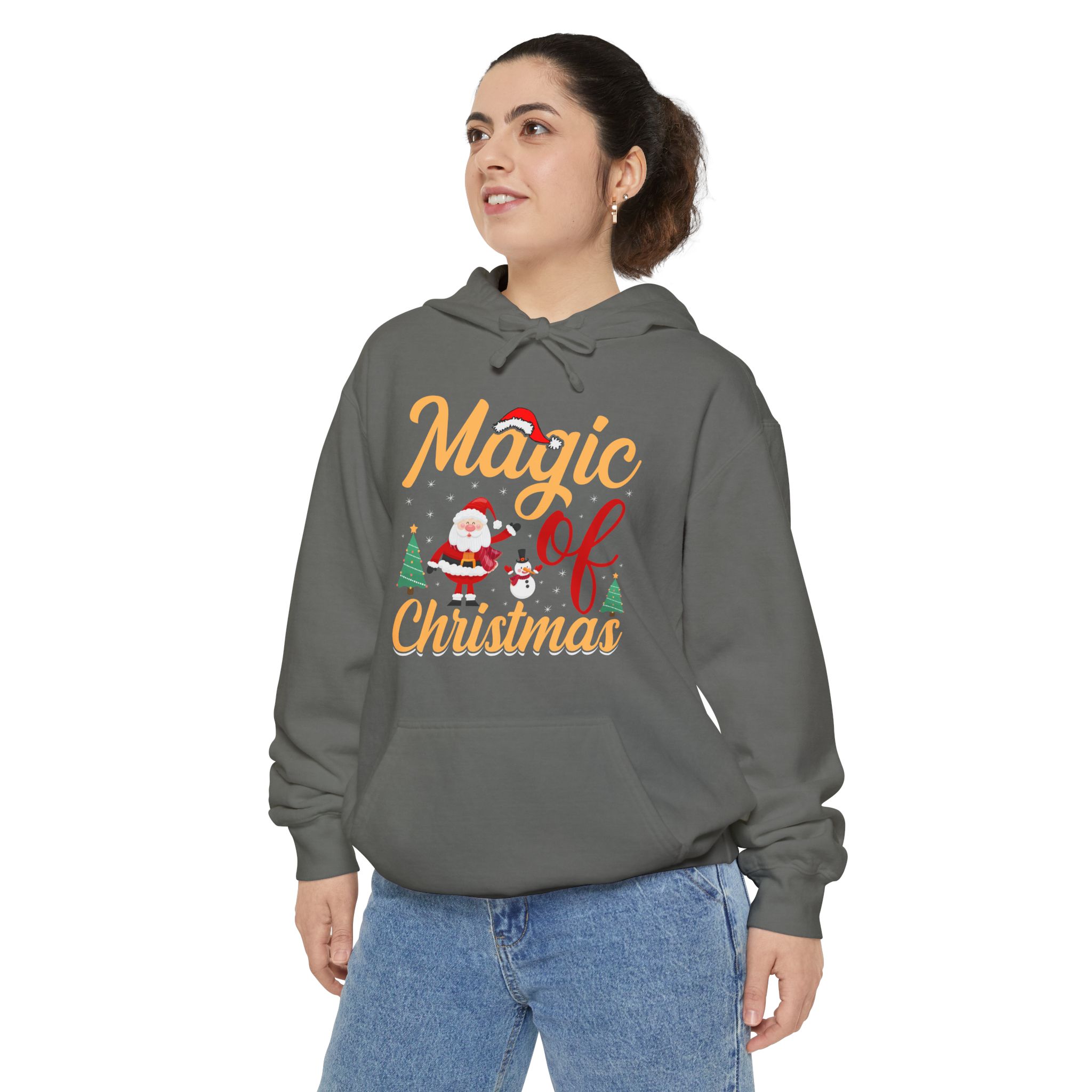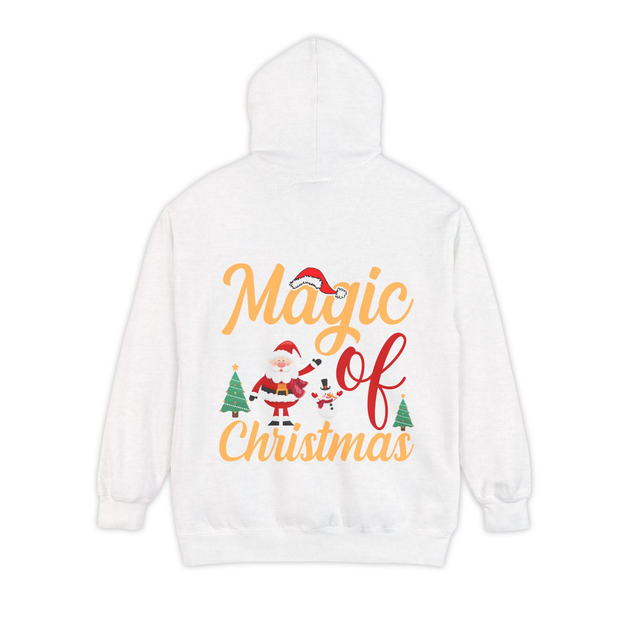 Wrap yourself in cozy holiday cheer with this garment-dyed hoodie that feels lived-in from the first wear. The soft 80/20 ringspun cotton blend and heavy-weight fabric give it a substantial, comforting drape while the relaxed fit invites long evenings by twinkling lights or chilly morning walks to sip something warm. A playful “Magic of Christmas” motif — complete with Santa, tiny trees, and cheerful lettering — sits on the chest, adding a nostalgic, handcrafted vibe that complements family gatherings, tree-trimming nights, and low-key holiday outings. Thoughtful details like a lined hood with matching drawcords, ribbed cuffs and hem that keep shape, and reinforced necktape ensure this hoodie stays comfortable and dependable year after year.