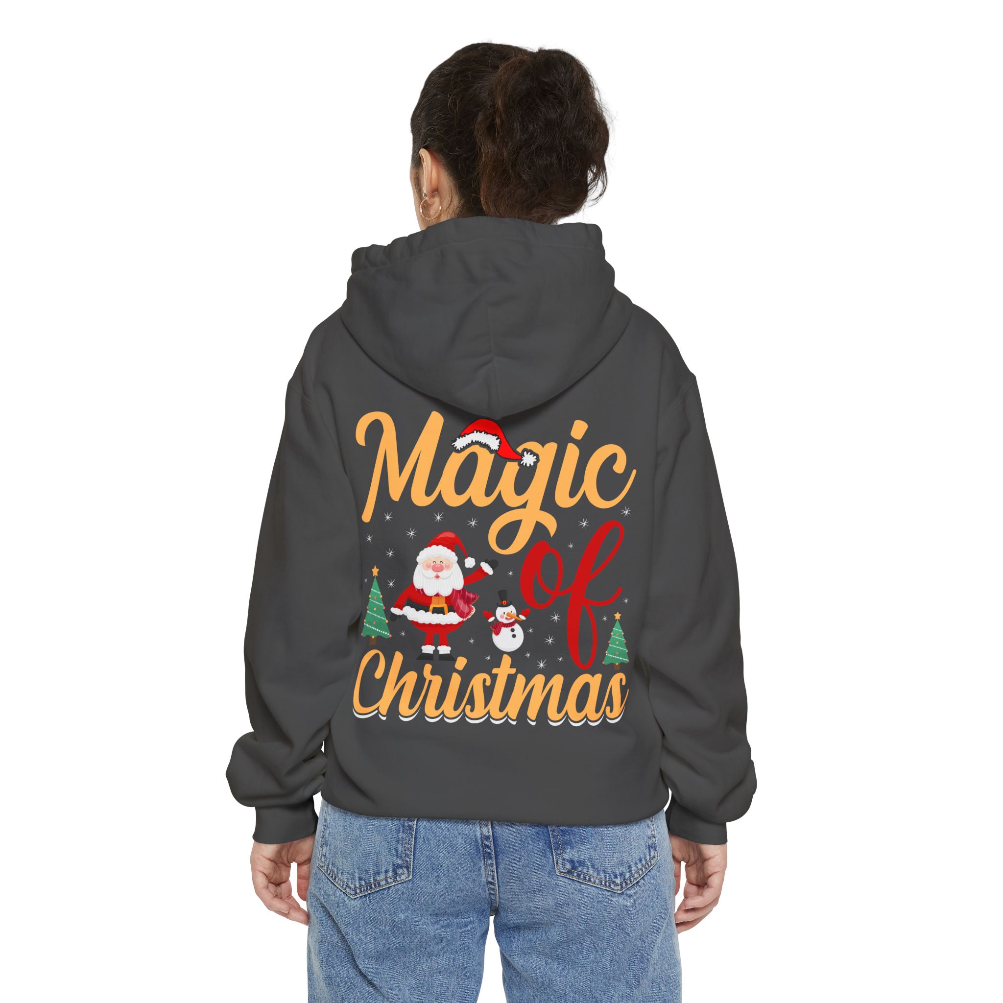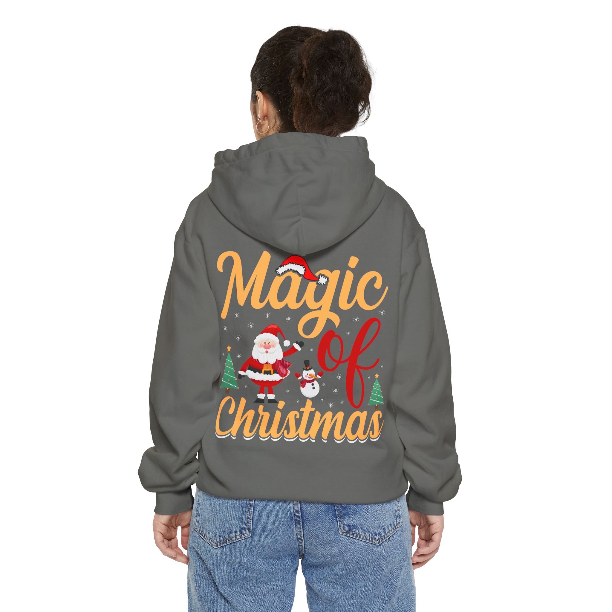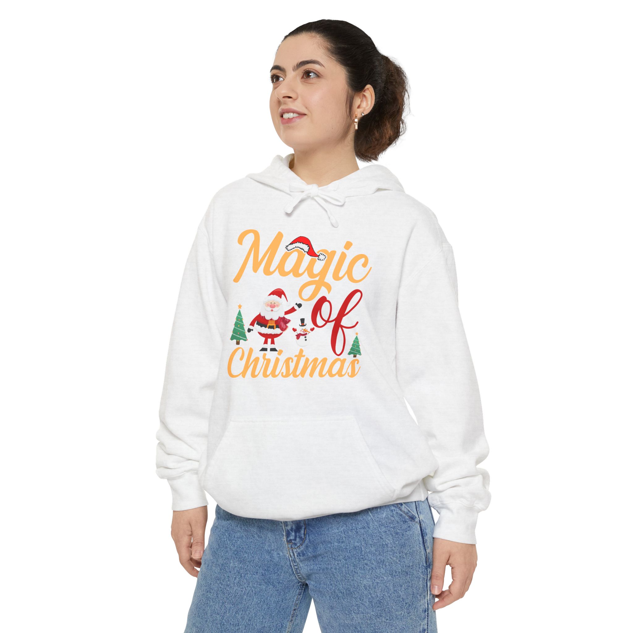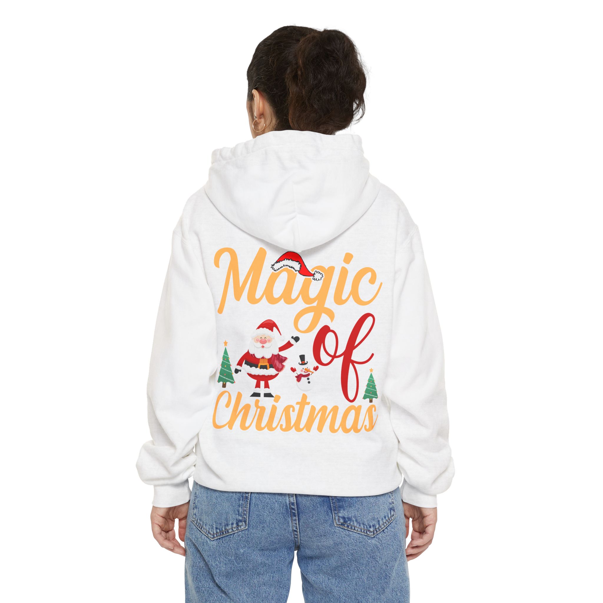 Wrap yourself in cozy holiday cheer with this garment-dyed hoodie that feels lived-in from the first wear. The soft 80/20 ringspun cotton blend and heavy-weight fabric give it a substantial, comforting drape while the relaxed fit invites long evenings by twinkling lights or chilly morning walks to sip something warm. A playful “Magic of Christmas” motif — complete with Santa, tiny trees, and cheerful lettering — sits on the chest, adding a nostalgic, handcrafted vibe that complements family gatherings, tree-trimming nights, and low-key holiday outings. Thoughtful details like a lined hood with matching drawcords, ribbed cuffs and hem that keep shape, and reinforced necktape ensure this hoodie stays comfortable and dependable year after year.
